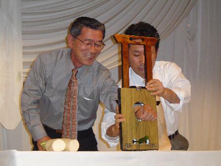 写真は豊中市議会議長さんの腕をギロチンにかけ、今まさに刃を落とそうとするところ。