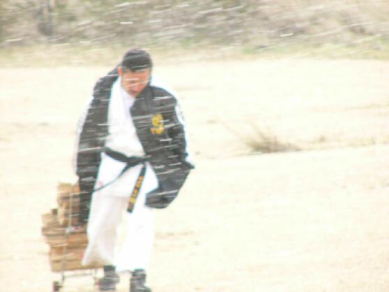 猛吹雪の中、暖をとる為の「薪」を運ぶ支部長。