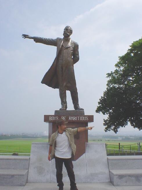 | 「北海道」に生まれて初めて来た支部長、クラーク博士の銅像の前で |