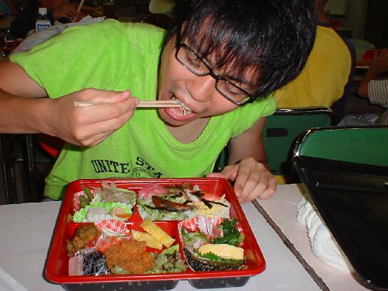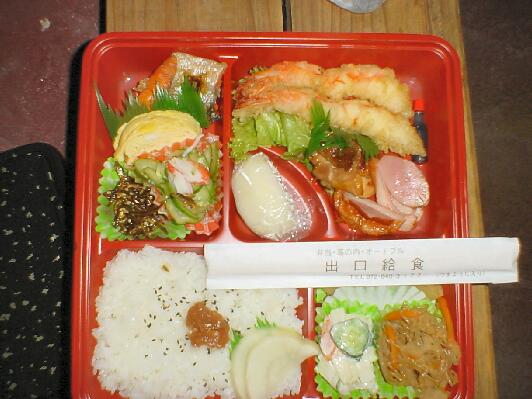 | 2日めの昼食も「出口給食」のお弁当を美味しく頂きました。出口先輩のご両親に作って頂いたお弁当、ホント、マジでうまかったっスッ! |