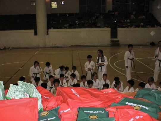 出口指導員の説明を真剣に聞き入る拳士たち。