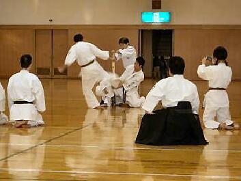 小中学生が帰ったあとに一般の稽古が始まります。型・組手から古武術に至るまで、激しく、厳しく、また、楽しく稽古しています。