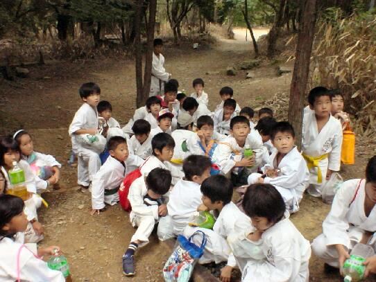 | 自然の空気を目いっぱい吸い込んでの黙想。森林の澄んだ空気は心と体をリラックスさせてくれます。「開眼!正面に対し礼っ!」 |